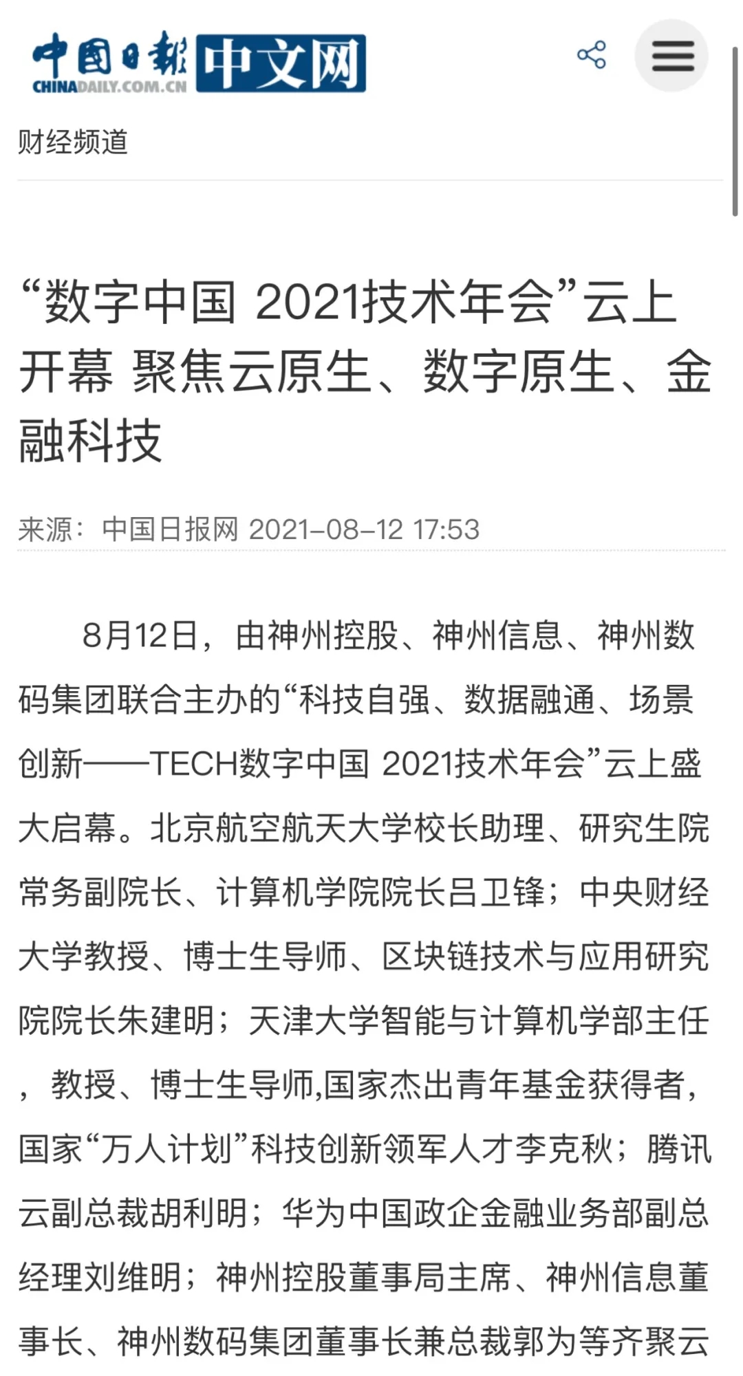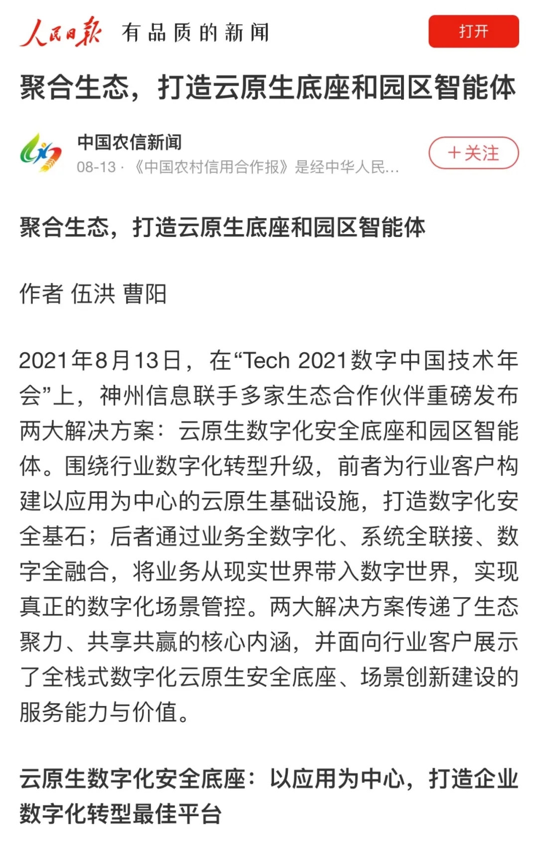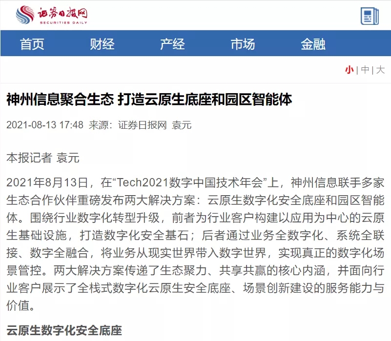 8月12日,由神州控股、神州信息、710公海寰宇集团联合主办的“科技自强、数据融通、场景创新——TECH数字中国 2021技术年会”云上盛大启幕,发布神州信创云、ModelB@nk5.0、金融超脑Sm@rtFSB、云原生数字化安全底座、园区智能体等重磅产品,国内各大权威、影响力媒体多角度多频次对盛况进行报道!